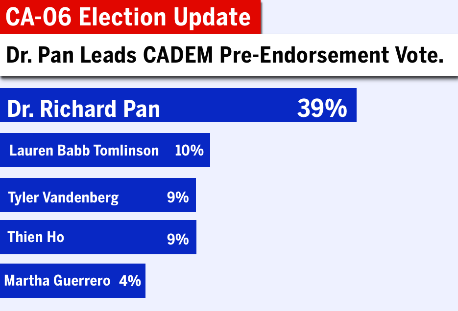 Pre-endorsement votes are cast by engaged Democratic leaders who are closely following the race and evaluating candidates. The resulting vote signals broad confidence in Dr. Pan’s values, record, and ability to run a successful campaign in CA-06.